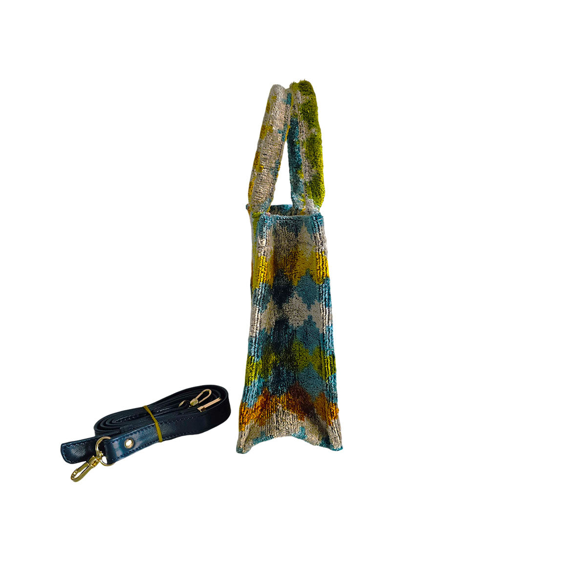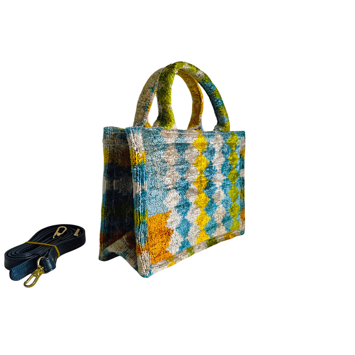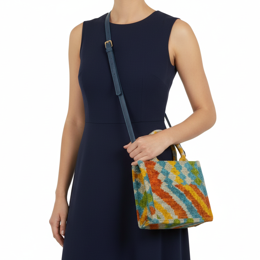 Discover the perfect blend of tradition and modernity with the Velvetica MINI Tote Bag, ( W23cm x H20cm x D8cm)  where luxurious craftsmanship meets eco-friendly innovation. This exquisite MINI tote bag is crafted from a rich blend of 75% silk velvet and 25% organic cotton, featuring a stunning Ikat pattern that exudes elegance and charm. The original bamboo handle not only enhances its natural beauty but also provides exceptional durability and a unique, eco-conscious touch.