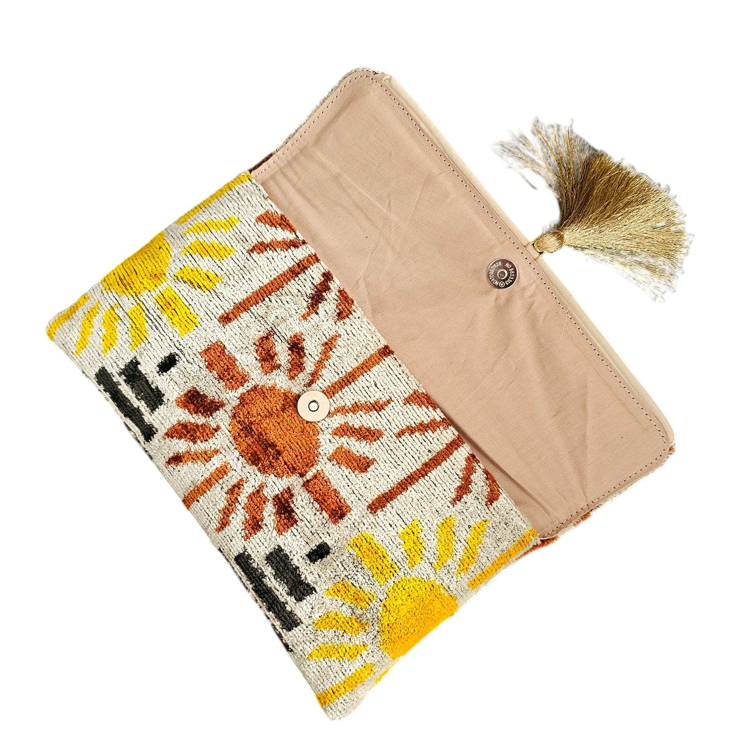 Where Boho-Chic Meets Versatile Luxury. Handcrafted in Turkey, this exquisite clutch blends the timeless beauty of Silk Velvet Ikat with modern functionality. Whether styled as a crossbody or carried by hand, it adds a sophisticated artisan touch to any ensemble.