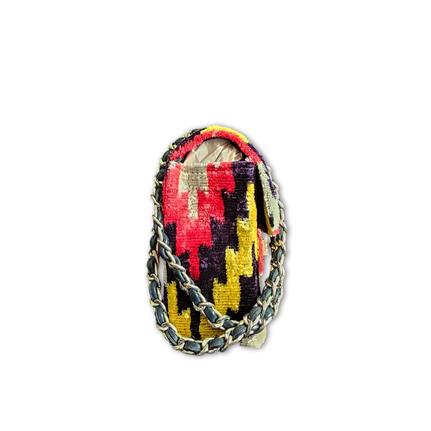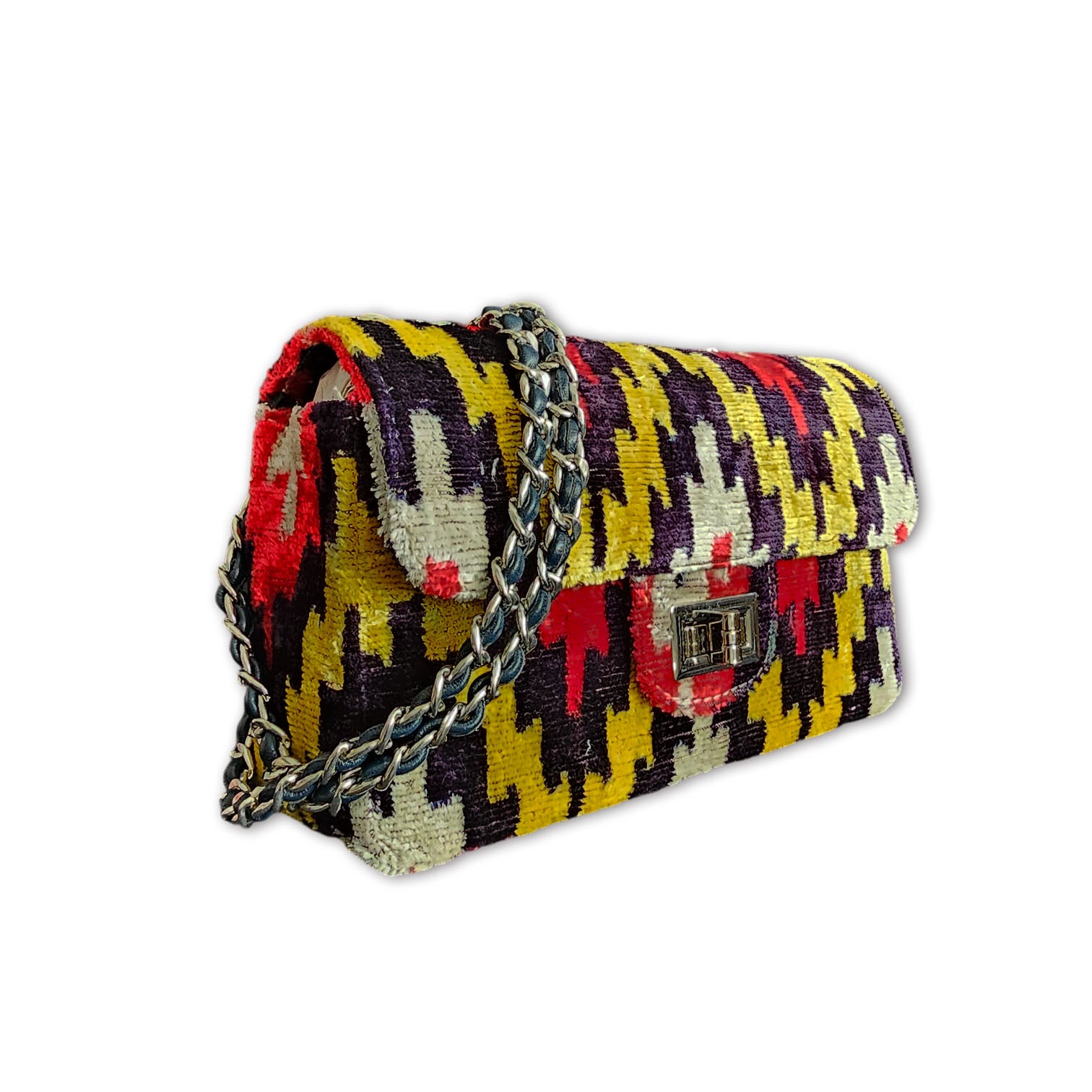 Where Boho-Chic Meets Practical Luxury. Handcrafted in Turkey, this exquisite piece blends the timeless beauty of Silk Velvet Ikat with smart design. Featuring a unique genuine leather braided chain, it ensures a secure, non-slip grip while adding a premium touch to your style.