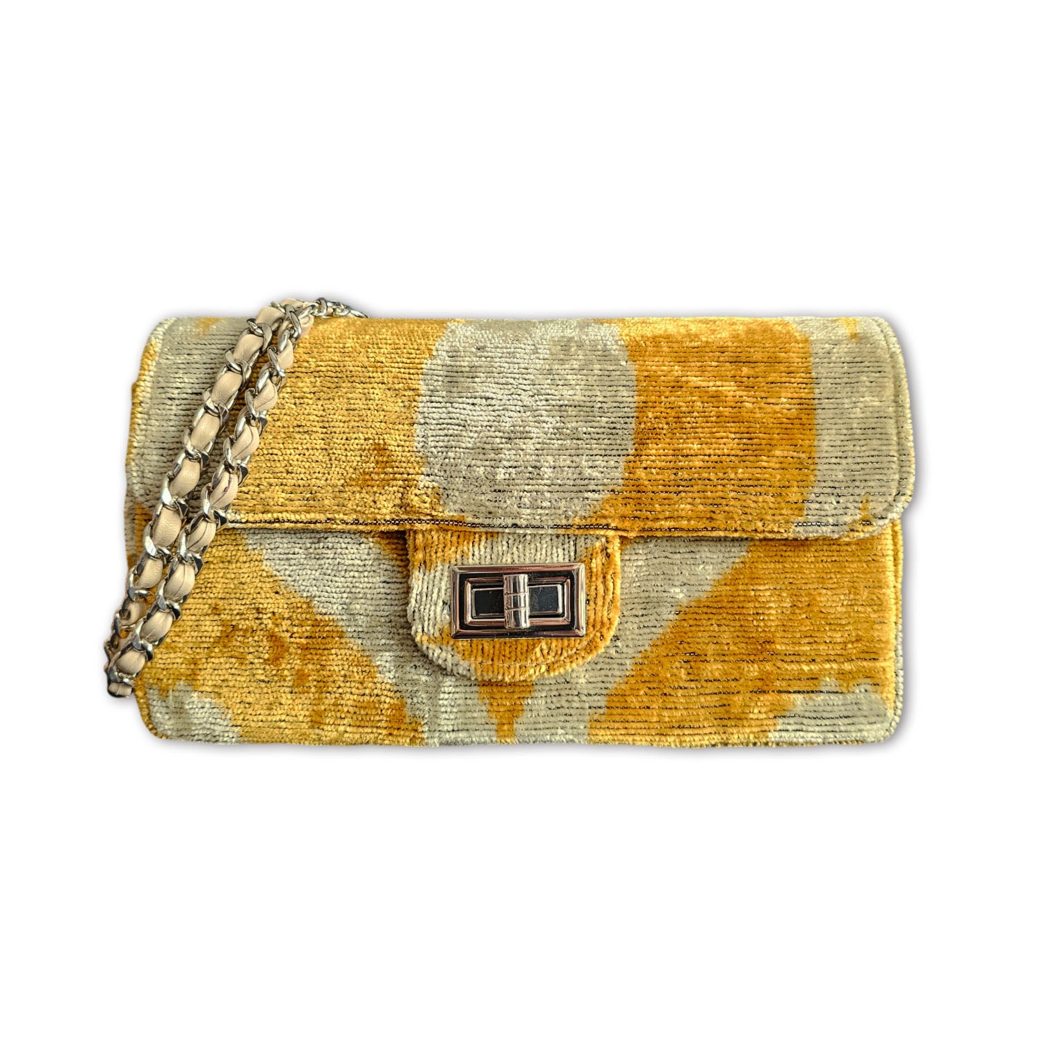 Where Boho-Chic Meets Practical Luxury. Handcrafted in Turkey, this exquisite piece blends the timeless beauty of Silk Velvet Ikat with smart design. Featuring a unique genuine leather braided chain, it ensures a secure, non-slip grip while adding a premium touch to your style.