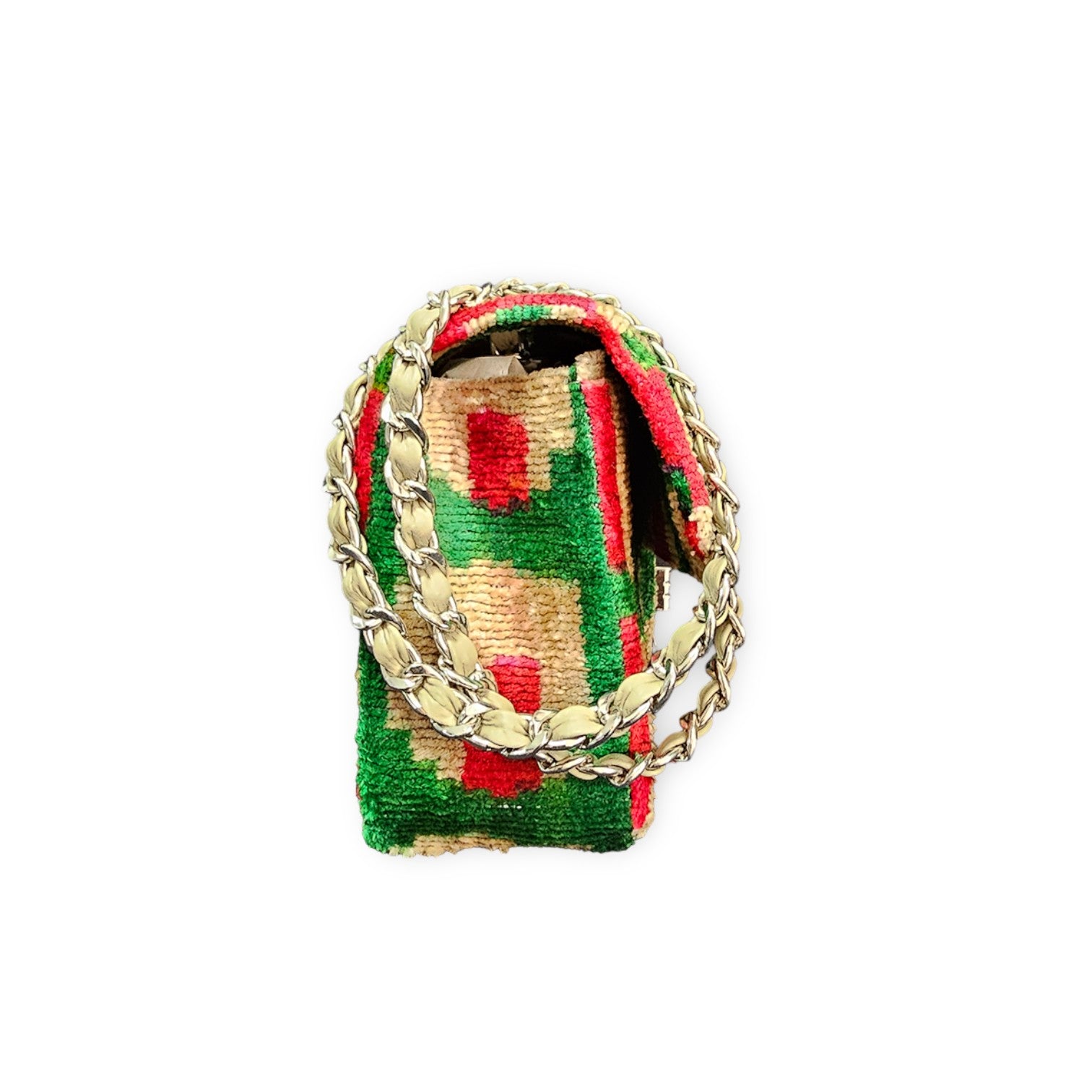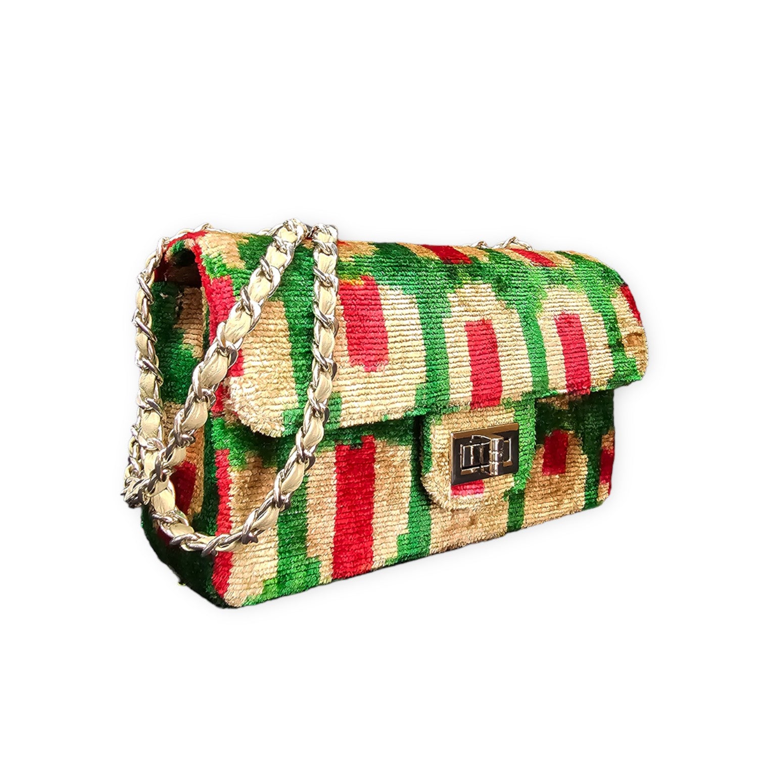 Where Boho-Chic Meets Practical Luxury. Handcrafted in Turkey, this exquisite piece blends the timeless beauty of Silk Velvet Ikat with smart design. Featuring a unique genuine leather braided chain, it ensures a secure, non-slip grip while adding a premium touch to your style.