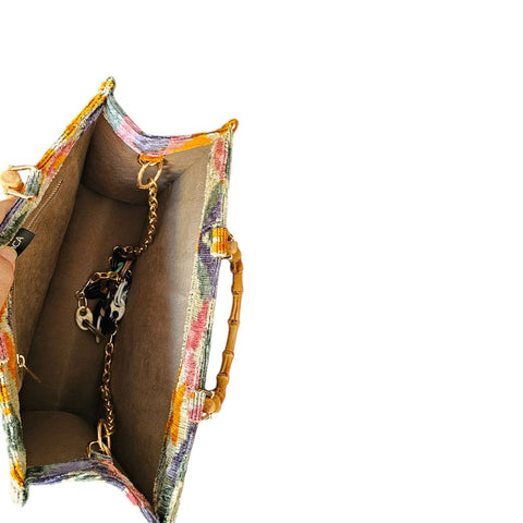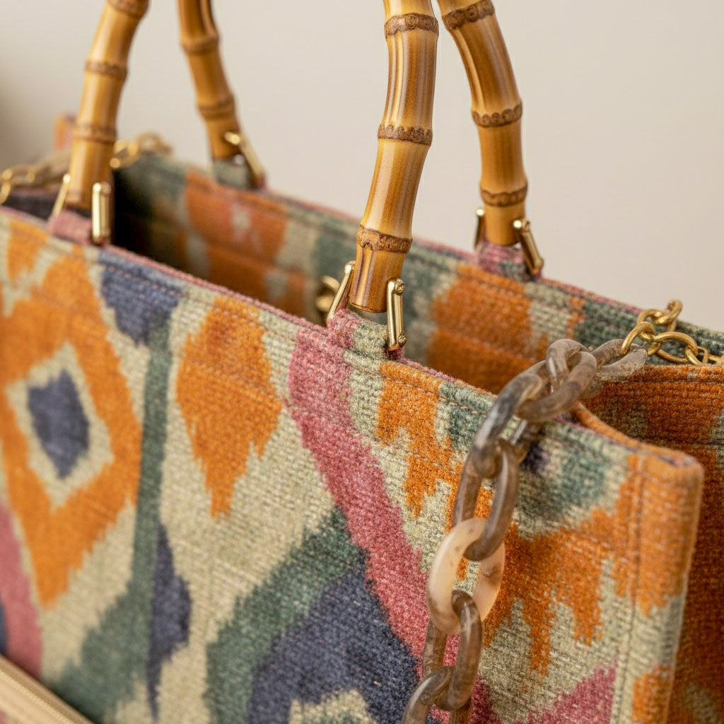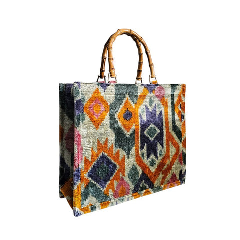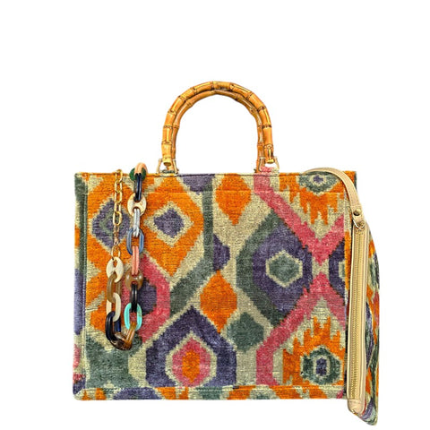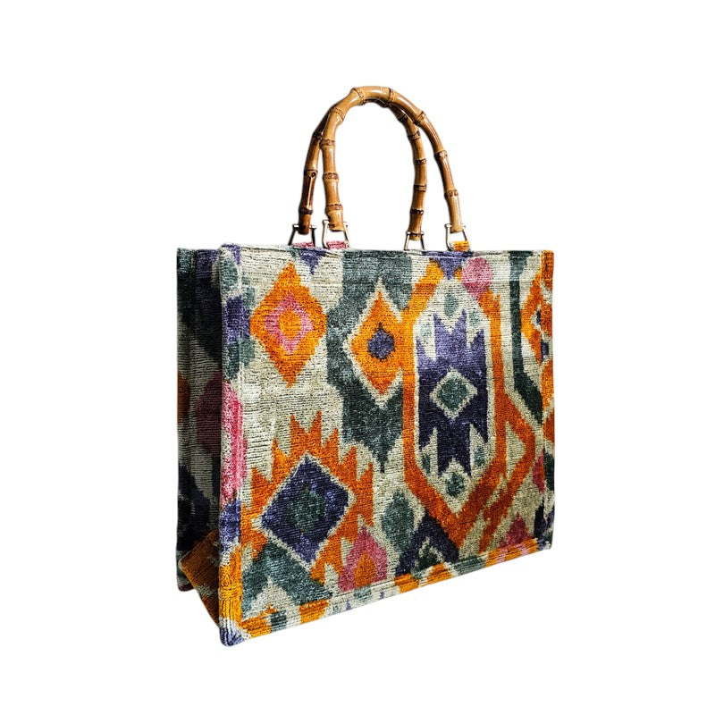 Entdecken Sie die perfekte Mischung aus Tradition und Moderne mit der Velvetica Mini-Tragetasche, bei der luxuriöse Handwerkskunst auf umweltfreundliche Innovation trifft. Diese exquisite Mini-Tragetasche ist aus einer reichhaltigen Mischung aus 75 % Seidensamt und 25 % Bio-Baumwolle gefertigt und verfügt über ein atemberaubendes Ikat-Muster, das Eleganz und Charme ausstrahlt.