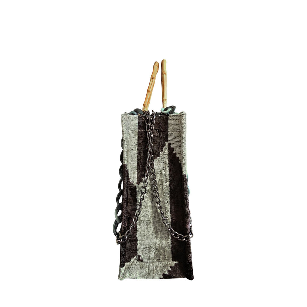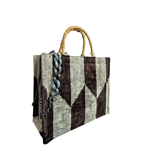 Discover the perfect blend of tradition and modernity with the Velvetica MEDIUM Tote Bag, where luxurious craftsmanship meets eco-friendly innovation. This exquisite MEDIUM tote bag is crafted from a rich blend of 75% silk velvet and 25% organic cotton, featuring a stunning Ikat pattern that exudes elegance and charm. The original bamboo handle not only enhances its natural beauty but also provides exceptional durability and a unique, eco-conscious touch.