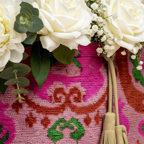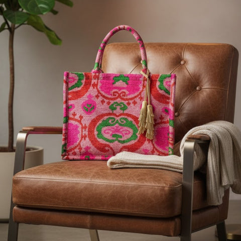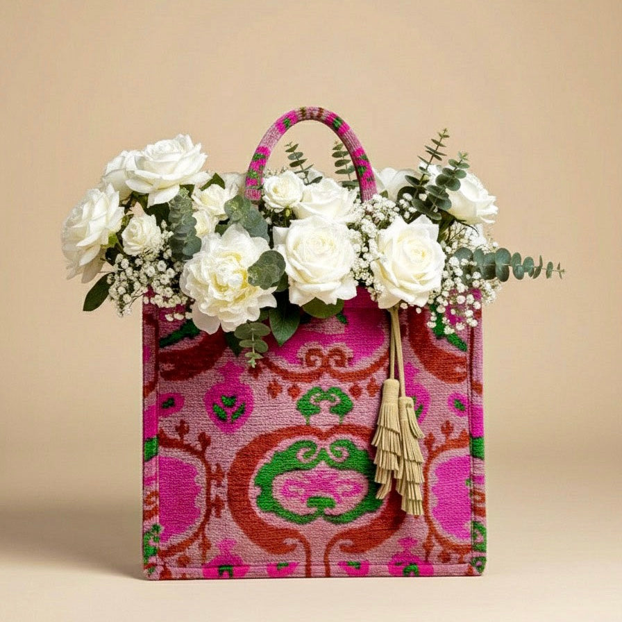 Are you searching for the perfect blend of tradition and modernity in a bag? Look no further than our Silk Velvet Tote Bag. These exquisite bags are crafted from luxurious silk velvet and feature a stunning Ikat pattern that exudes elegance and charm. Ideal for any occasion, from shopping trips to travel adventures, this bag is a must-have accessory that combines practicality and style.