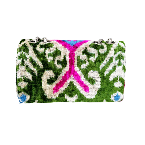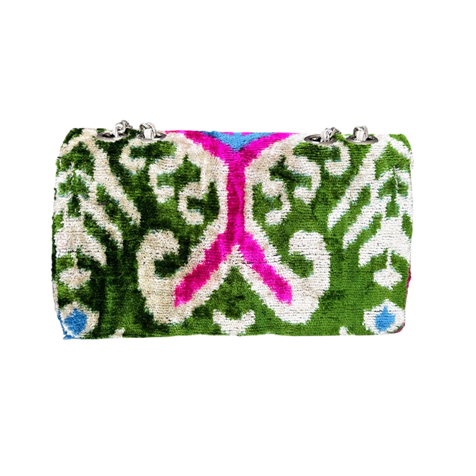 Where boho-chic meets practical luxury. Handcrafted in Turkey, this exquisite piece blends the timeless beauty of Silk Velvet Ikat with smart design. Featuring a unique genuine leather braided chain, it ensures a secure, non-slip grip while adding a premium touch to your style.