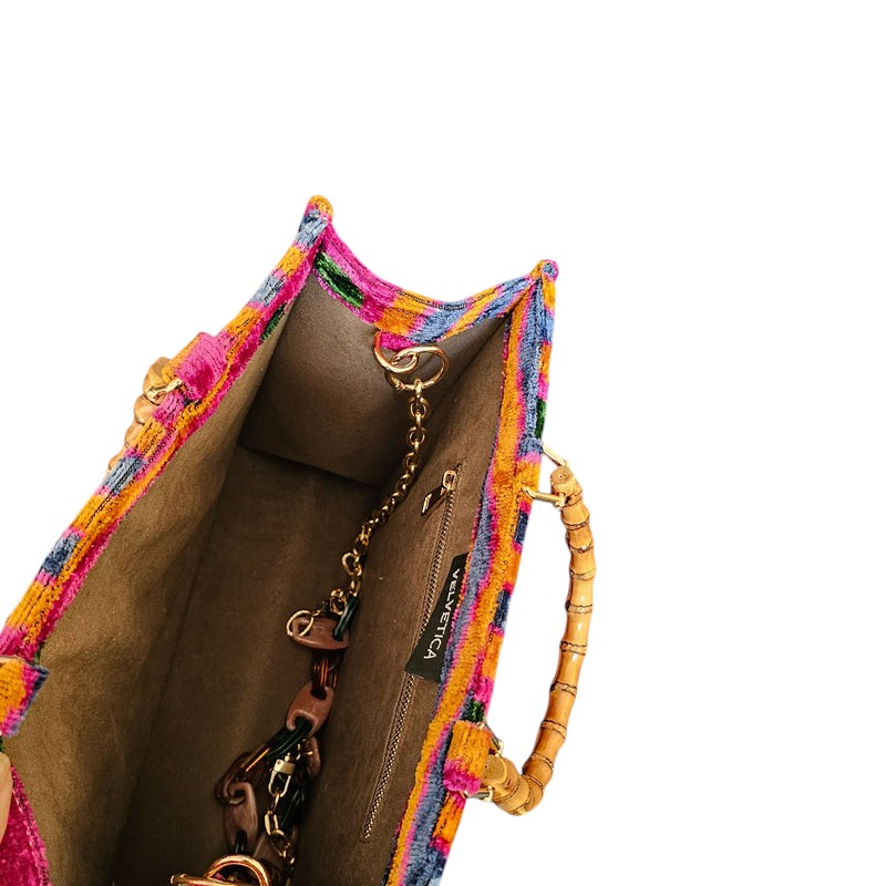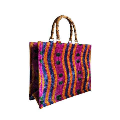 Discover the perfect blend of tradition and modernity with the Velvetica MEDIUM Tote Bag, where luxurious craftsmanship meets eco-friendly innovation. This exquisite MEDIUM tote bag is crafted from a rich blend of 75% silk velvet and 25% organic cotton, featuring a stunning Ikat pattern that exudes elegance and charm. The original bamboo handle not only enhances its natural beauty but also provides exceptional durability and a unique, eco-conscious touch.