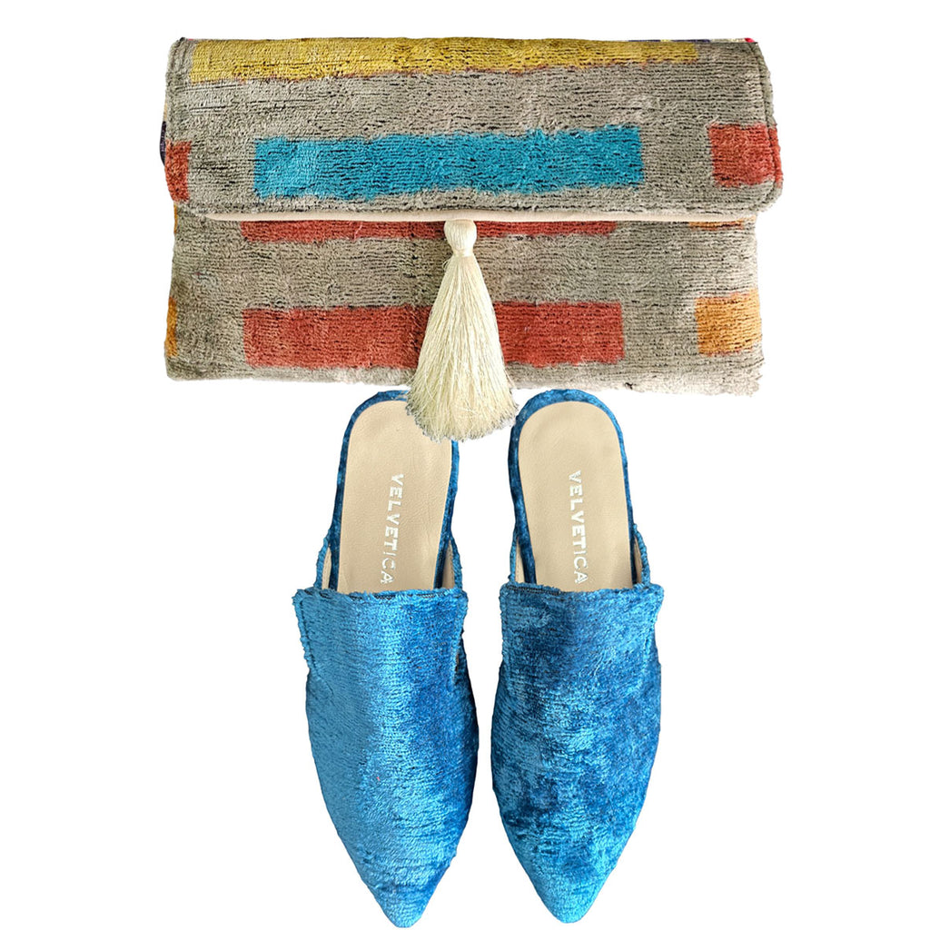 Are you searching for a set that effortlessly blends tradition with modern style while offering the perfect balance of elegance and comfort? Look no further than the Velvetica Clutch Bag and Slippers Set. This exquisite duo combines luxurious silk velvet and stunning Ikat patterns, ensuring you stay stylish on any occasion.