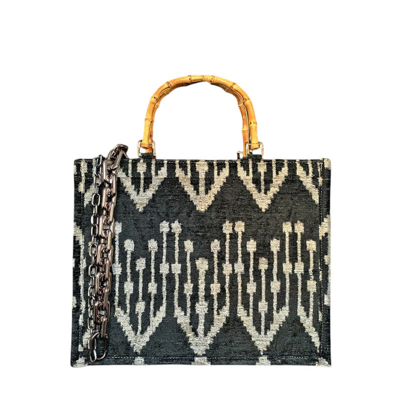 Scopri il perfetto mix di tradizione e modernità con la Velvetica Mini Tote Bag, dove la lussuosa artigianalità incontra l'innovazione ecosostenibile. Questa squisita mini tote bag è realizzata in una ricca miscela di velluto di seta al 75% e cotone biologico al 25%, con uno straordinario motivo Ikat che trasuda eleganza e fascino. L'originale manico in bambù non solo esalta la sua bellezza naturale, ma offre anche una durata eccezionale e un tocco unico ed ecosostenibile.