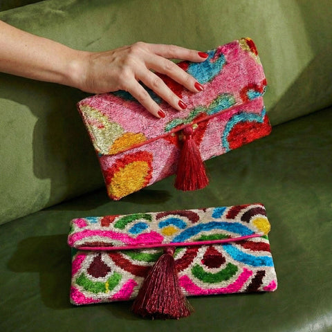 Where Boho-Chic Meets Versatile Luxury. Handcrafted in Turkey, this exquisite clutch blends the timeless beauty of Silk Velvet Ikat with modern functionality. Whether styled as a crossbody or carried by hand, it adds a sophisticated artisan touch to any ensemble.