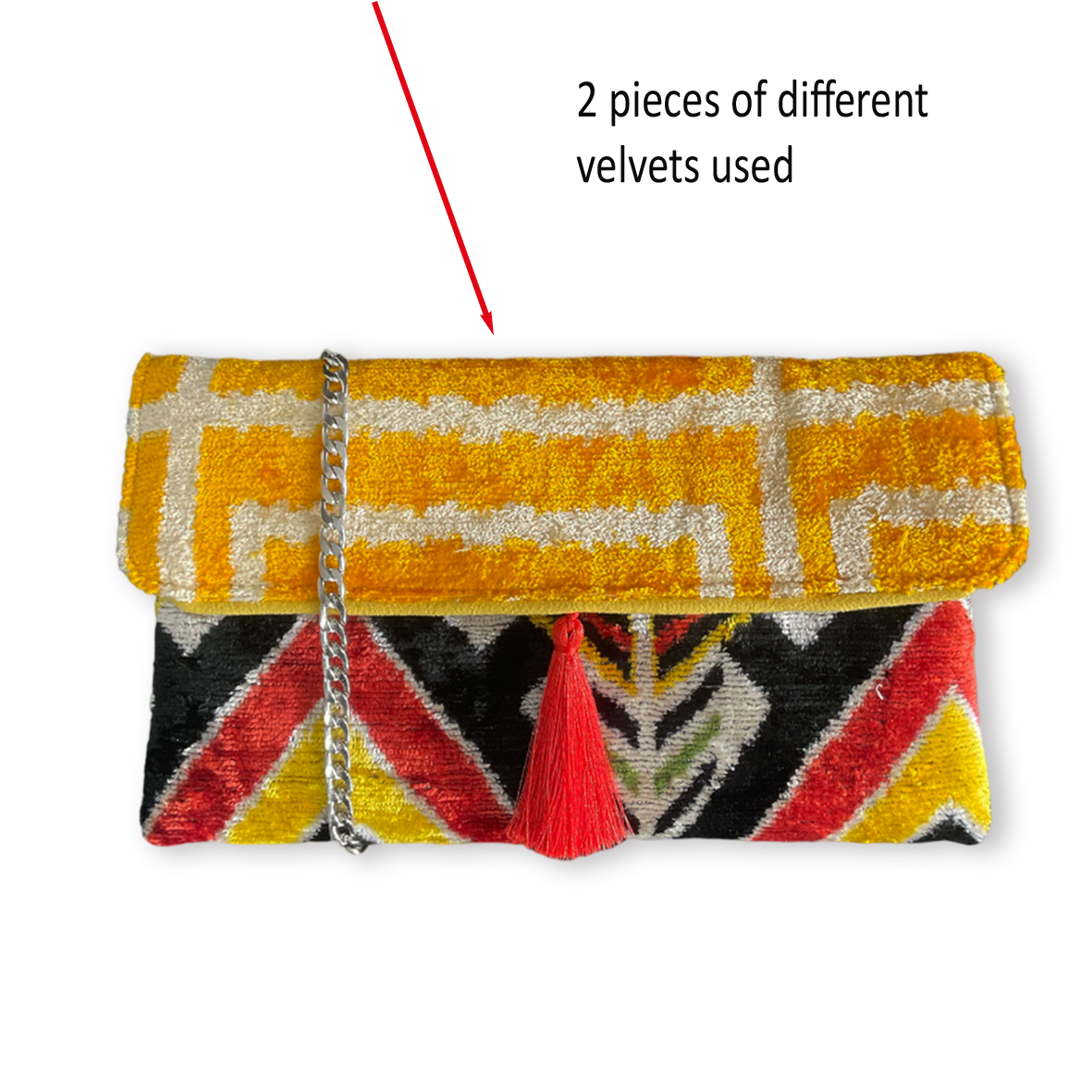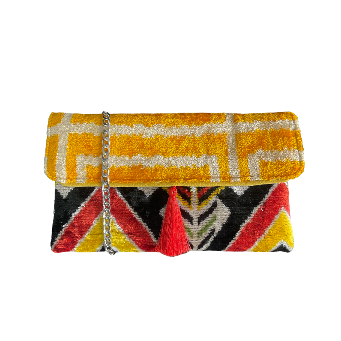 Where Boho-Chic Meets Versatile Luxury. Handcrafted in Turkey, this exquisite clutch blends the timeless beauty of Silk Velvet Ikat with modern functionality. Whether styled as a crossbody or carried by hand, it adds a sophisticated artisan touch to any ensemble.