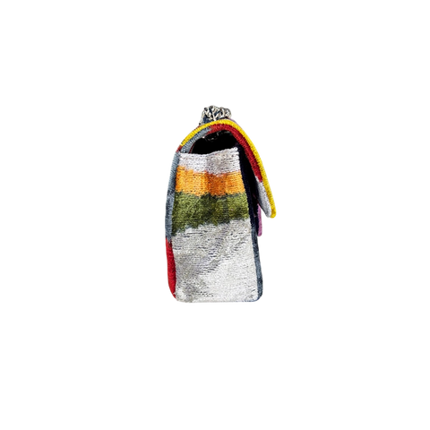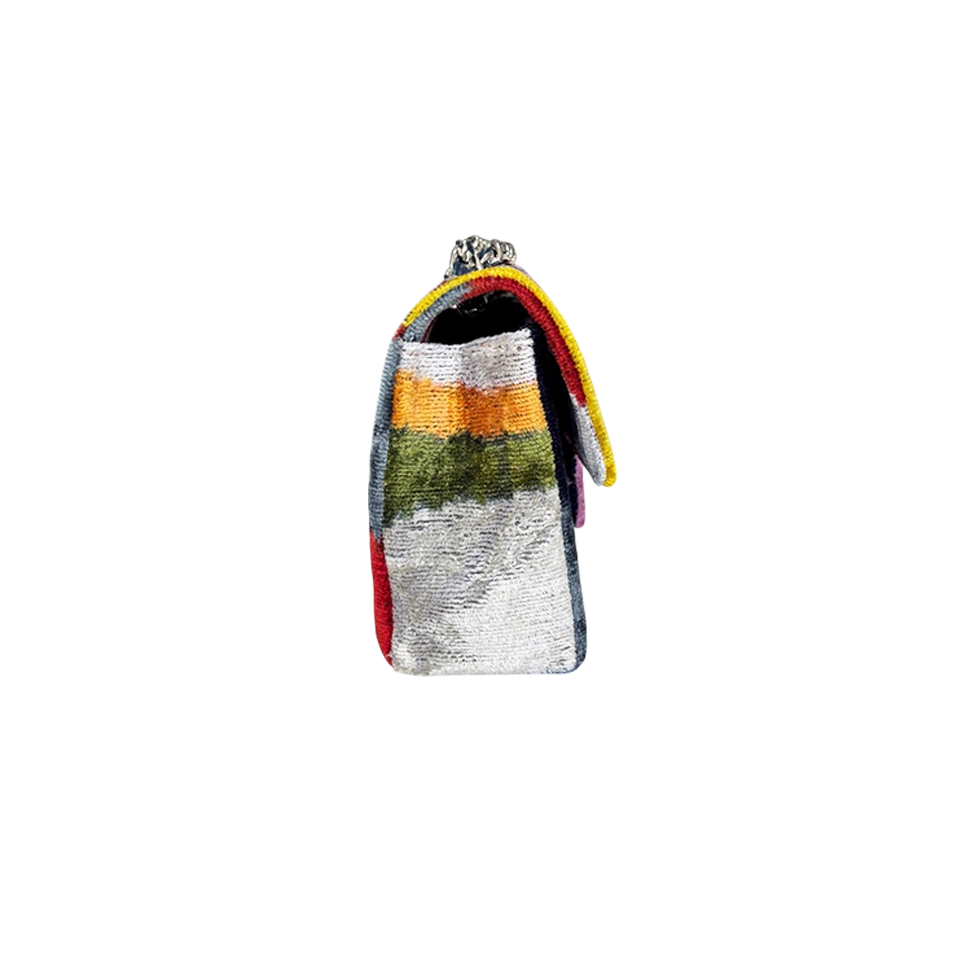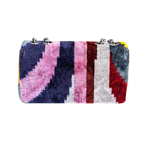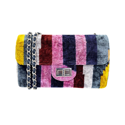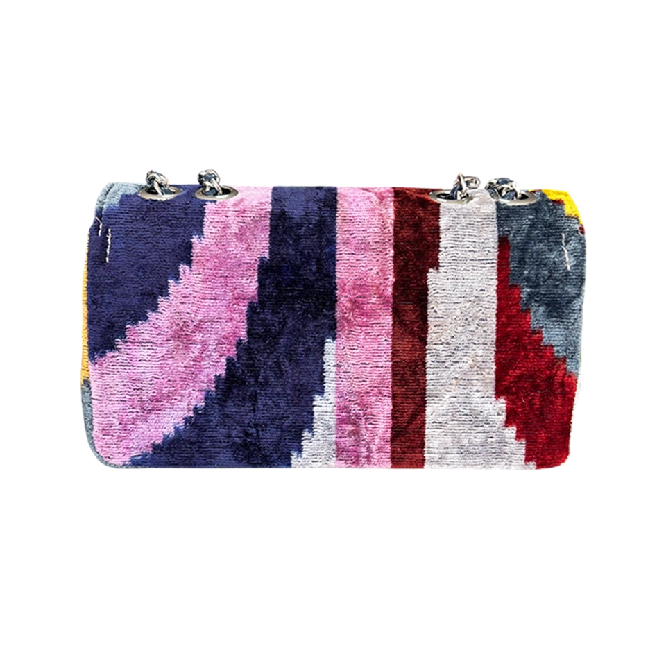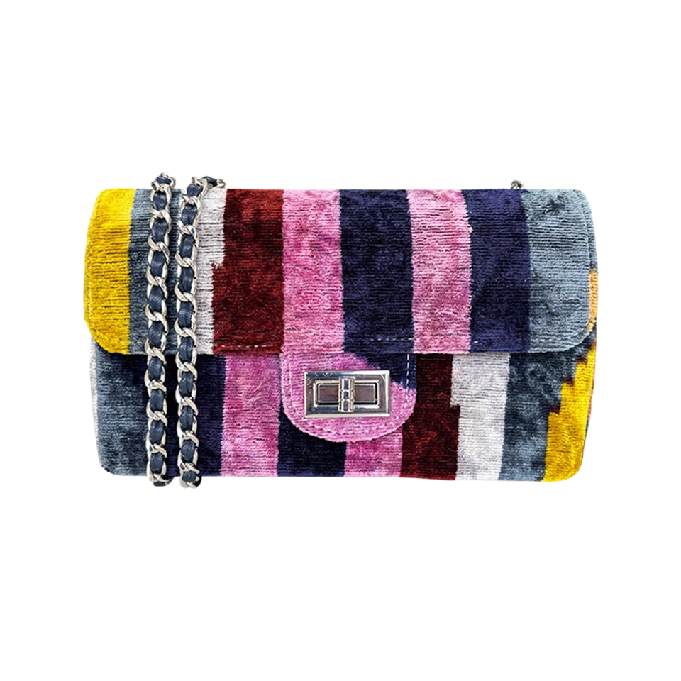 Where boho-chic meets practical luxury. Handcrafted in Turkey, this exquisite piece blends the timeless beauty of Silk Velvet Ikat with smart design. Featuring a unique genuine leather braided chain, it ensures a secure, non-slip grip while adding a premium touch to your style.