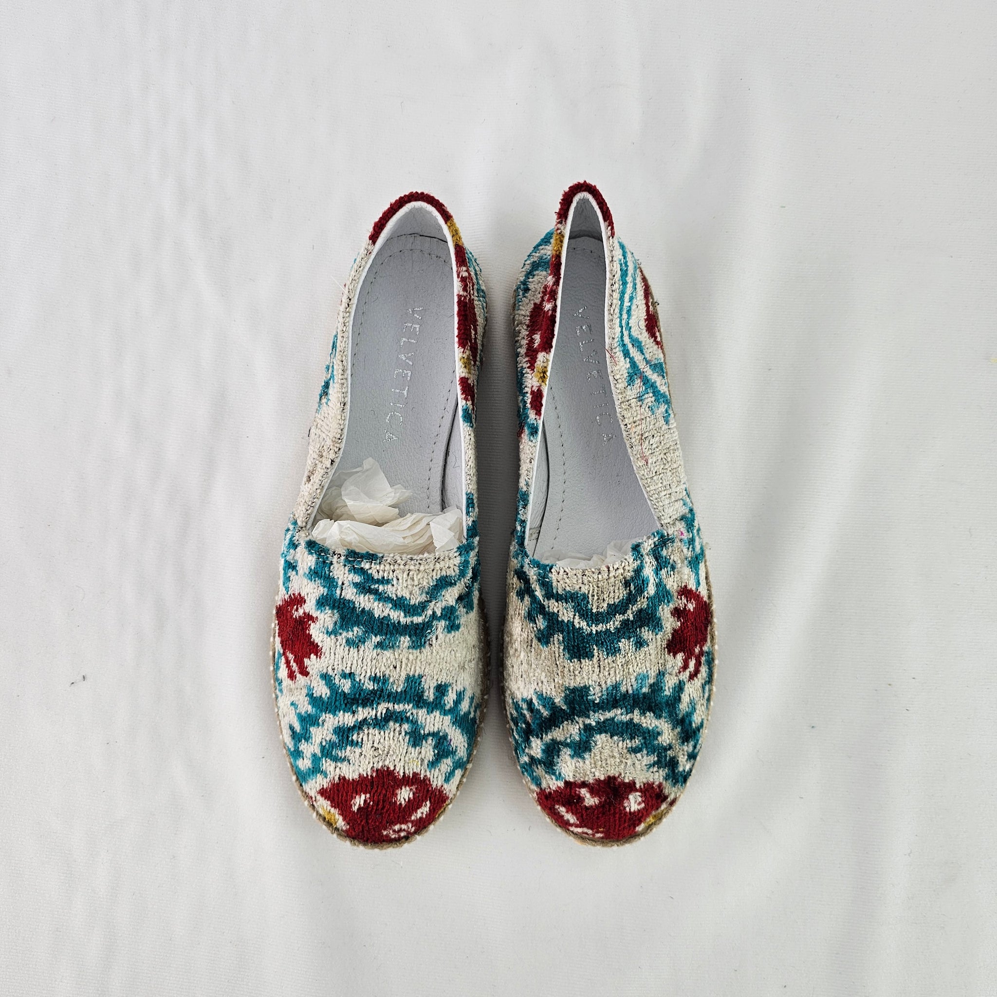 Velvetica's new Espadril's are made with Ikat silk velvet outside adn soft genuine leather inside... They can be used indoors or outdoors... in all your favorite colours ! They are cool, comfortable, well made and eye -catching ! All-day comfort and long-lasting durability.