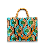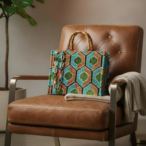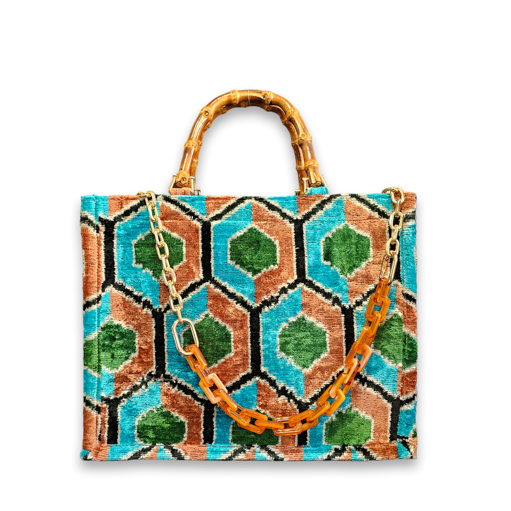 Discover the perfect blend of tradition and modernity with the Velvetica MEDIUM Tote Bag, where luxurious craftsmanship meets eco-friendly innovation. This exquisite MEDIUM tote bag is crafted from a rich blend of 75% silk velvet and 25% organic cotton, featuring a stunning Ikat pattern that exudes elegance and charm. The original bamboo handle not only enhances its natural beauty but also provides exceptional durability and a unique, eco-conscious touch.