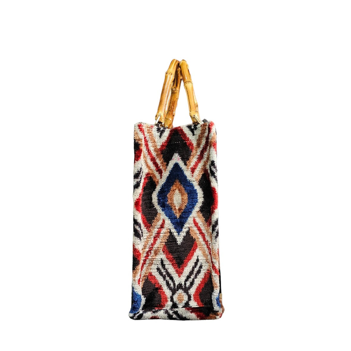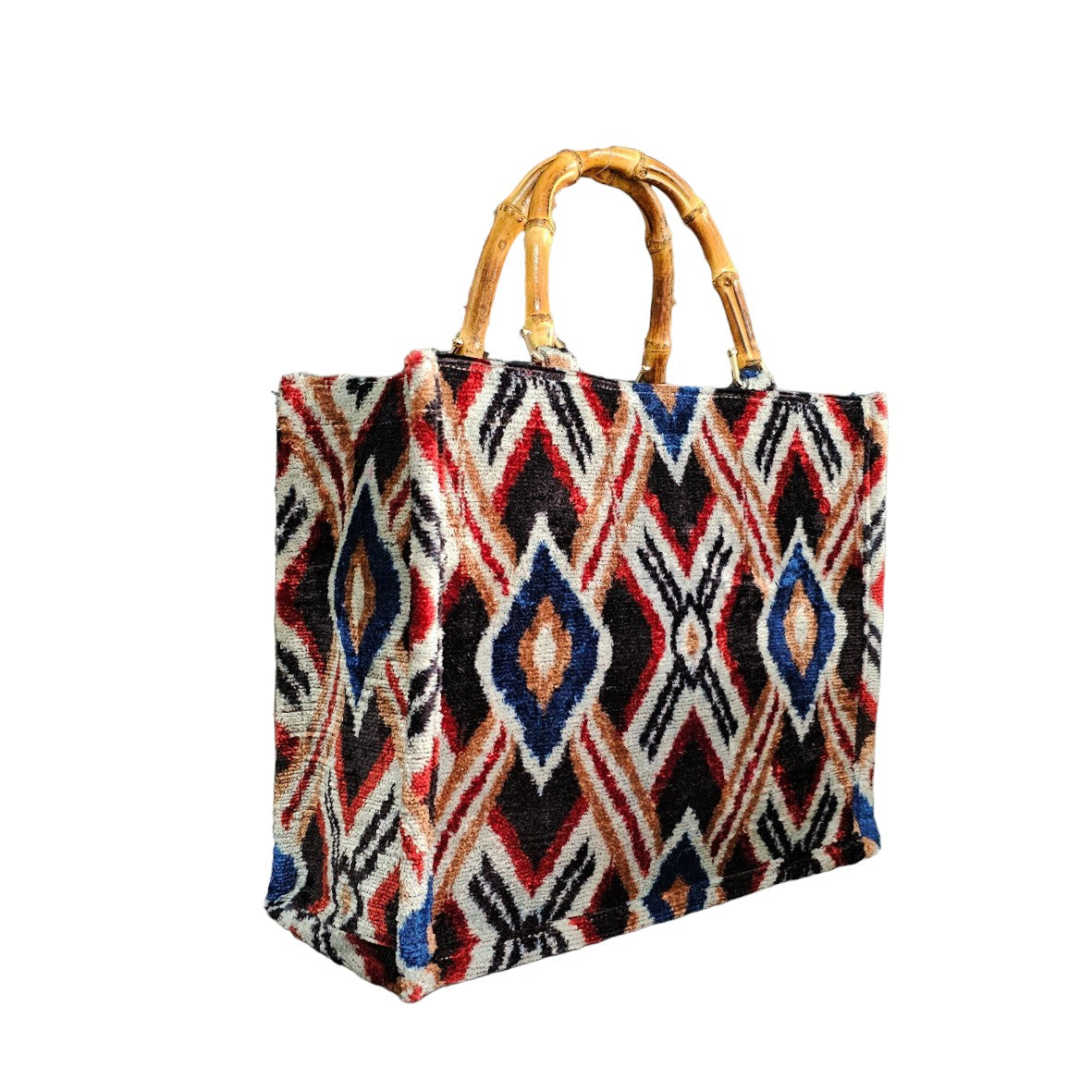 Where Nature Meets Artisan Luxury. Handcrafted in Turkey and designed in Italy, this limited edition tote blends traditional Ikat artistry with modern sustainability. Featuring authentic bamboo handles, it is a statement piece of eco-friendly elegance.