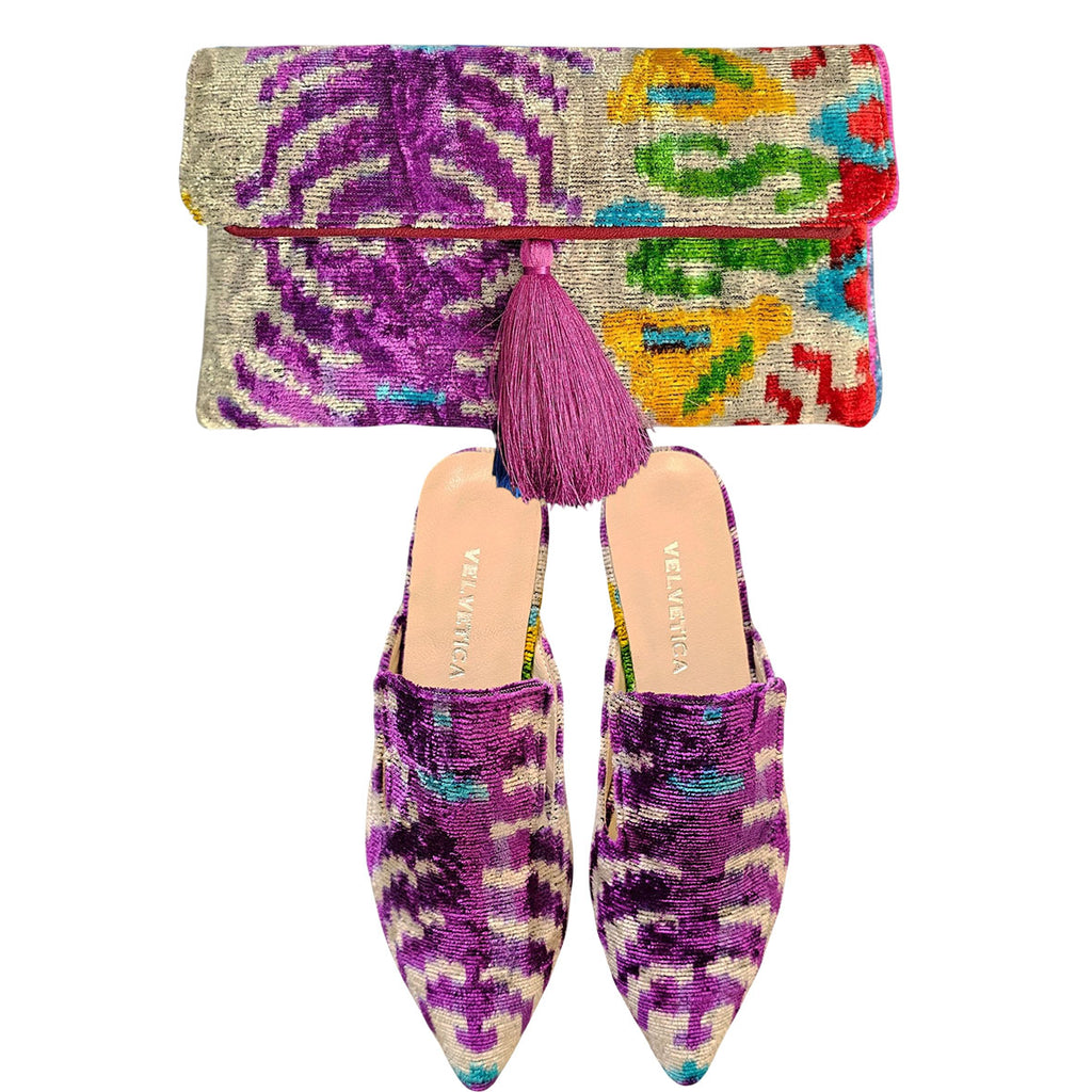Are you searching for a set that effortlessly blends tradition with modern style while offering the perfect balance of elegance and comfort? Look no further than the Velvetica Clutch Bag and Slippers Set. This exquisite duo combines luxurious silk velvet and stunning Ikat patterns, ensuring you stay stylish on any occasion.