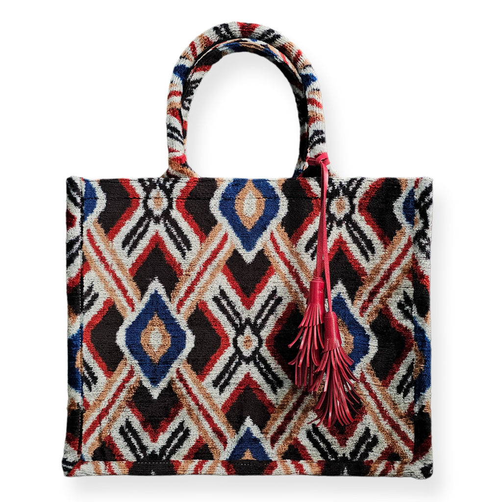 Are you searching for the perfect blend of tradition and modernity in a bag? Look no further than our Silk Velvet Tote Bag. These exquisite bags are crafted from luxurious silk velvet and feature a stunning Ikat pattern that exudes elegance and charm. Ideal for any occasion, from shopping trips to travel adventures, this bag is a must-have accessory that combines practicality and style.