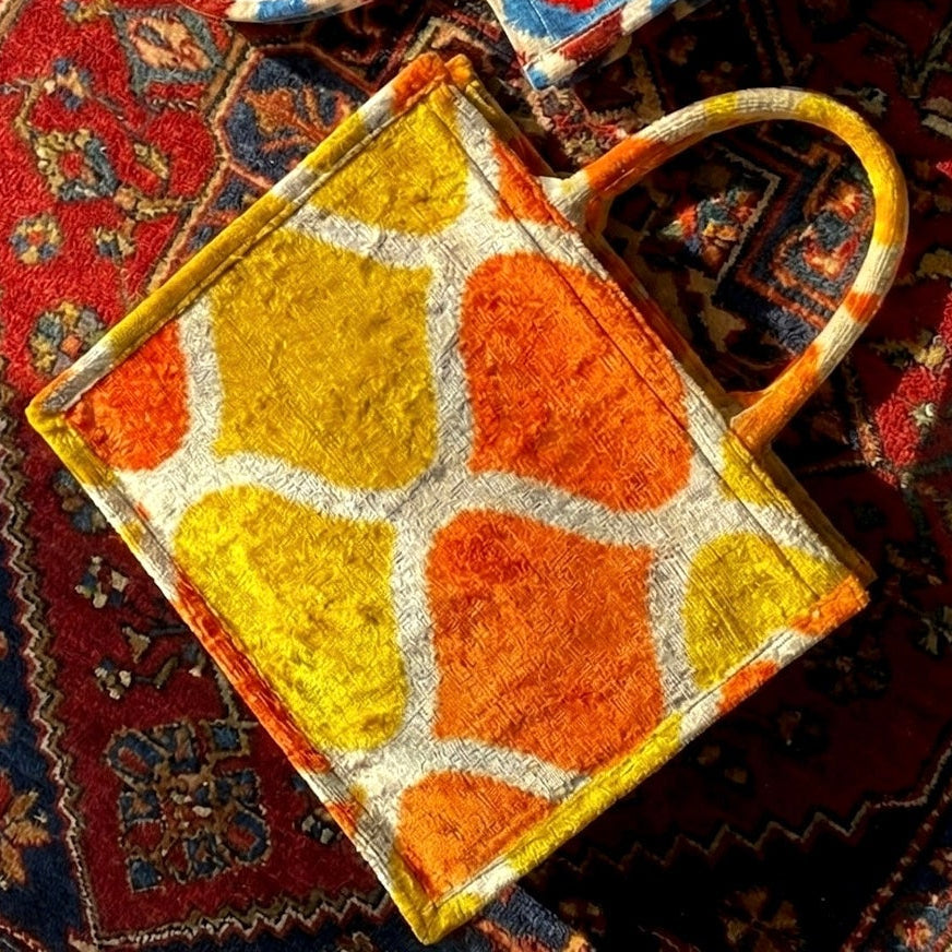 Are you searching for the perfect blend of tradition and modernity in a bag? Look no further than our Silk Velvet Tote Bag. These exquisite bags are crafted from luxurious silk velvet and feature a stunning Ikat pattern that exudes elegance and charm. Ideal for any occasion, from shopping trips to travel adventures, this bag is a must-have accessory that combines practicality and style.